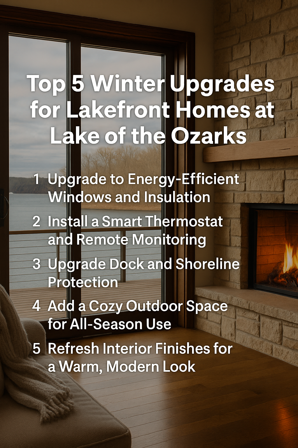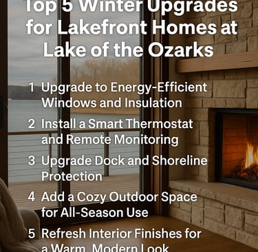 Homes at Lake of the Ozarks When the temperatures drop and the boats are docked for the season, Lake of the Ozarks takes on a quiet beauty — calm water, crisp air, and the perfect time to give your lakefront home some attention. The off-season is ideal for tackling upgrades that not only make winter living more comfortable but also boost long-term value. Here are five smart projects that can make your lake home shine year-round. 1. Upgrade to Energy-Efficient Windows and Insulation If your home still has original windows or aging insulation, winter at the Lake will remind you fast. Modern, energy-efficient windows keep warm air inside, reduce drafts, and protect your investment from the moisture common in lakeside climates. Adding insulation to attics, crawl spaces, and rim joists is another cost-effective improvement. Together, these upgrades can trim heating bills by 10–20% while keeping your home cozier on those windy nights. 2. Install a Smart Thermostat and Remote Monitoring For second-home owners or weekend visitors, smart thermostats are a game-changer. Systems like Nest or Ecobee let you monitor and control temperatures remotely, preventing frozen pipes and wasted energy. Pair it with water-leak sensors and a smart security system to keep tabs on your property when you’re away. Many Lake homeowners use these systems to check in on humidity levels and ensure docks, garages, and basements stay safe through the freeze-thaw season. Peace of mind is priceless when you’re miles from the water. 3. Upgrade Dock and Shoreline Protection Winter is hard on docks, lifts, and seawalls — especially during ice expansion and fluctuating water levels. Off-season is the perfect time for maintenance or upgrades because water traffic is minimal and contractors are more available. Consider replacing worn cables, adding bumpers, or investing in a de-icer or agitator system to protect pilings and boat lifts. If you’ve noticed erosion or cracking along your seawall, a shoreline inspection and repair now can save thousands later. Think of it as winterizing not just your home, but your piece of the Lake itself. 4. Add a Cozy Outdoor Space for All-Season Use Even in the chill of winter, Lake Ozark evenings are meant to be enjoyed outdoors. Transform your deck or patio into a four-season space with infrared heaters, a covered pergola, or an enclosed sunroom. Fire pits, stone fireplaces, or built-in seating areas invite family and friends to gather even when it’s 40 degrees and fog rolls across the cove. Warm lighting, throw blankets, and weather-resistant furniture make it feel like an extension of your living room — and it photographs beautifully when it’s time to list your home. 5. Refresh Interior Finishes for a Warm, Modern Look Winter light at the Lake has a way of revealing every outdated surface. Use the slower season to refresh paint, flooring, and lighting. Earthy tones, matte brass fixtures, and textured wallpaper are trending and pair perfectly with the lake’s natural palette. If your home still carries that 1990s cabin vibe, small updates like LVP flooring or neutral quartz countertops instantly modernize without losing charm. For homeowners eyeing resale in the coming year, these simple touches make a strong first impression — especially when paired with high-speed Co-Mo internet for remote work or streaming by the fire. Final Thought Whether you live at Lake of the Ozarks full-time or visit on weekends, winter is your opportunity to turn downtime into lasting value. By investing in efficiency, comfort, and protection now, you’ll enjoy smoother sailing come spring — and maybe a higher asking price down the road. After all, lake life isn’t just about summer. It’s about keeping your home ready for every season the Lake brings.